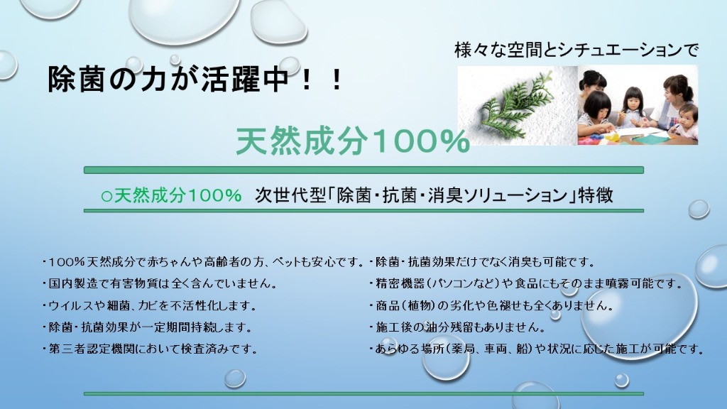 天然成分100%、安心安全な除菌消臭液ですので赤ちゃんや妊婦さん、ペットがいる環境、お部屋だけでなく飲食店や店舗、テナントでの施工も可能です。
